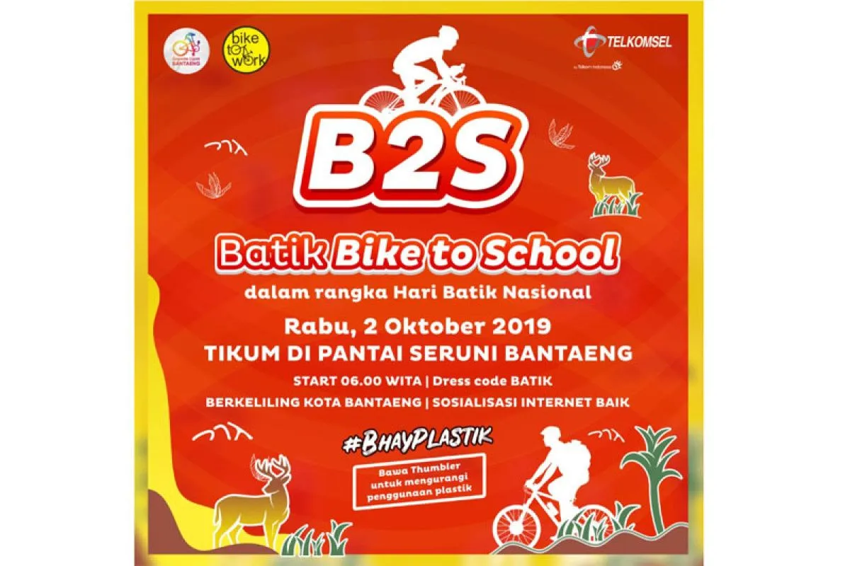 Bantaeng (ANTARA) - Bike to Work (B2W) atau Komunitas Pekerja Bersepeda Indonesia Chapter Bantaeng bekerja sama dengan Komunitas Sepeda Lipat menggandeng Telkomsel menggelar "batik bike to school" dalam rangkaian Peringatan Hari Batik Nasional tingkat Kabupaten Bantaeng, pada 2 Oktober 2019.
