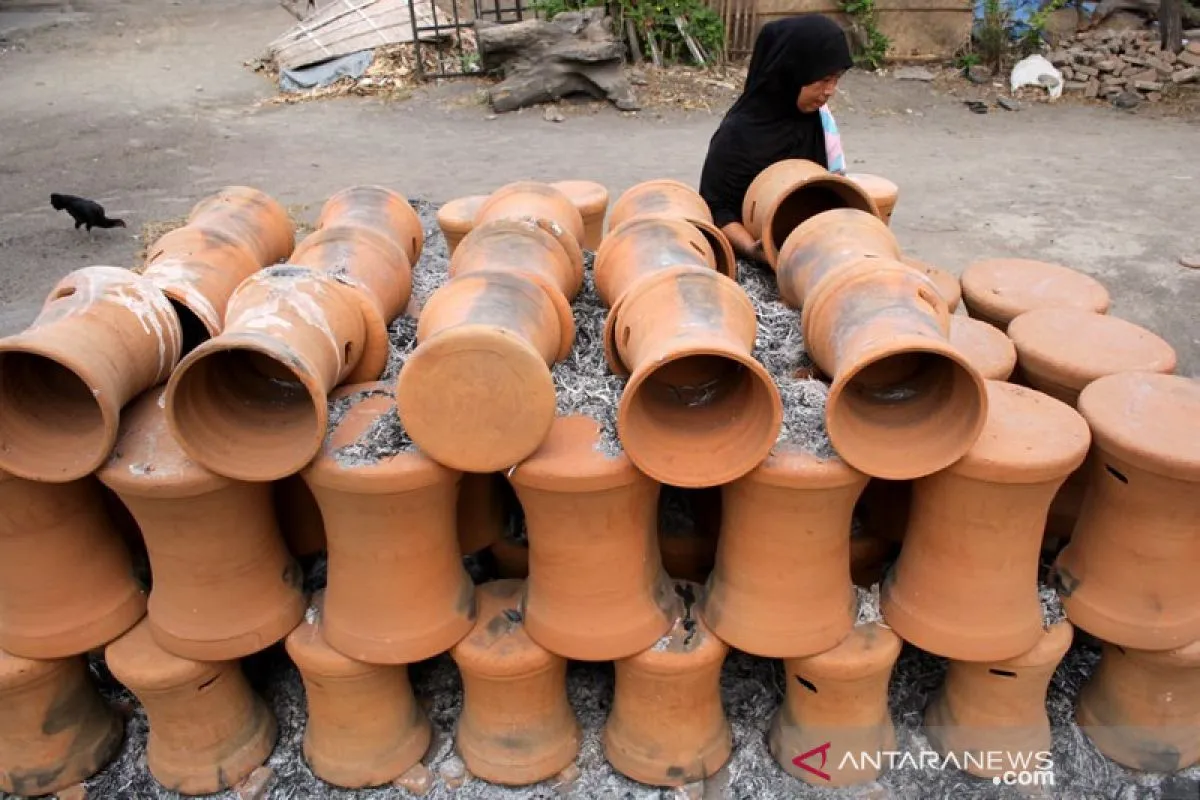 Perajin menyelesaikan pembuatan gerabah di Kecamatan Pattallassang, Takalar, Sulawesi Selatan, Kamis (7/11/2019). Perajin setempat mengaku mampu memproduksi sebanyak 20 gerabah dalam sepekan saat kemarau karena proses pengeringannya cepat, naik dua kali lipat dibanding saat musim hujan yang hanya mencapai 10 buah per pekan. ANTARA FOTO/Arnas Padda/YU