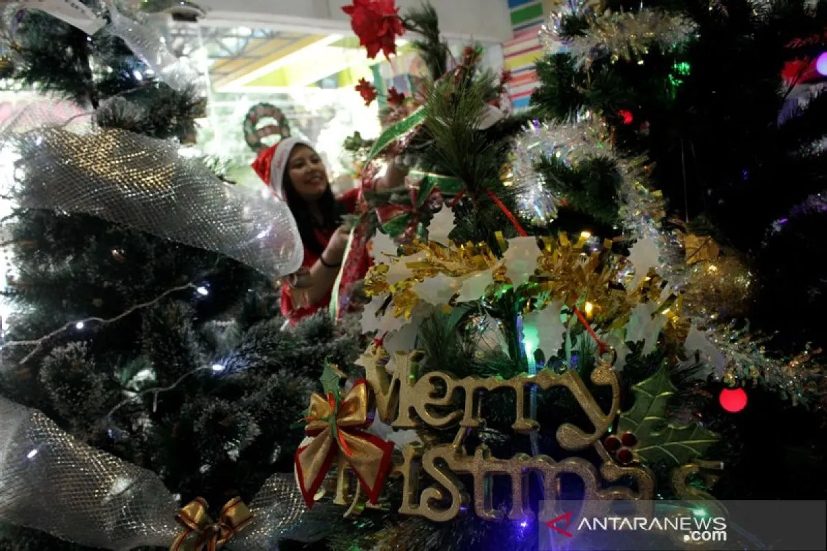 Penjual menghias pohon natal yang dijual di salah satu toko di Makassar, Sulawesi Selatan, Sabtu (21/12/2019). Pemilik toko mengatakan penjualan pohon natal yang dijual dengan harga Rp200 ribu - Rp7,5 juta per pohon tergantung ukuran tersebut mengalami peningkatan jelang perayaan Natal 2019 dibanding tahun sebelumnya. ANTARA FOTO/Arnas Padda/YU