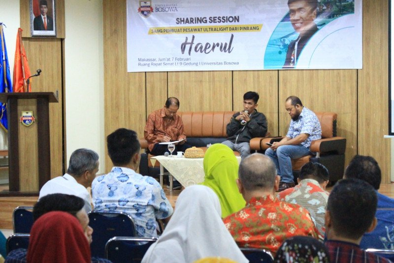 Makassar (ANTARA) - Haerul yang merupakan perakit pesawat ultralight dari bahan-bahan sederhana asal Kabupaten Pinrang berbagi inspirasi dan motivasinya dalam membuat inovasi bagi para mahasiswa dan dosen di Universitas Bosowa (Unibos) Makassar, Jumat.