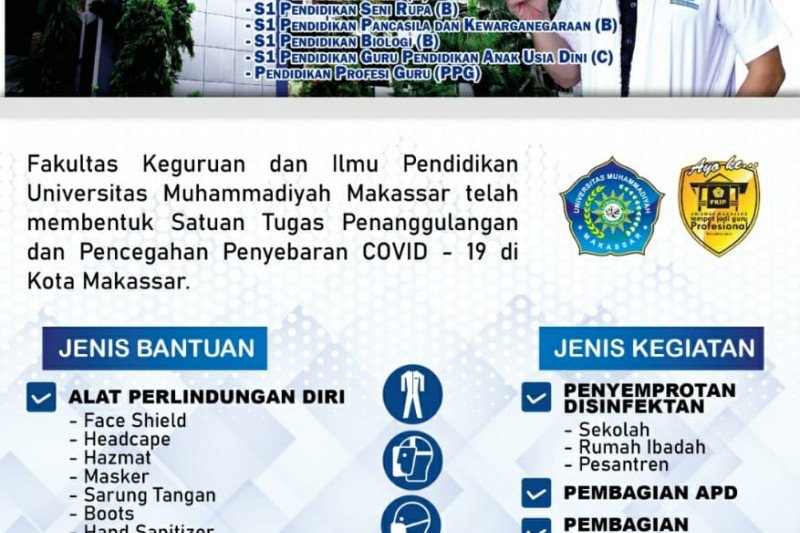 Selain itu, tim satgas juga telah membagikan 2000 masker dari 5000 masker yang ditargetkan untuk dibagikan. Termasuk FKIP Unismuh telah memesan APD yang akan diberikan bagi petugas kesehatan di puskesmas dan rumah sakit rujukan penanganan COVID-19.*