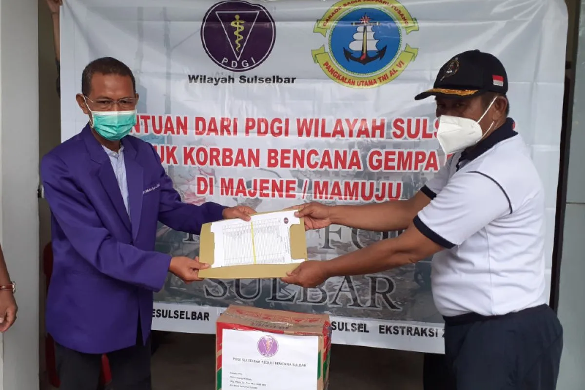 Makassar (ANTARA) - Persatuan Dokter Gigi Indonesia (PDGI) wilayah Sulawesi Selatan dan Sulawesi Barat (Sulselbar) menyerahkan bantuan untuk korban bencana gempa bumi di Mamuju dan Majene, Sulawesi Barat.