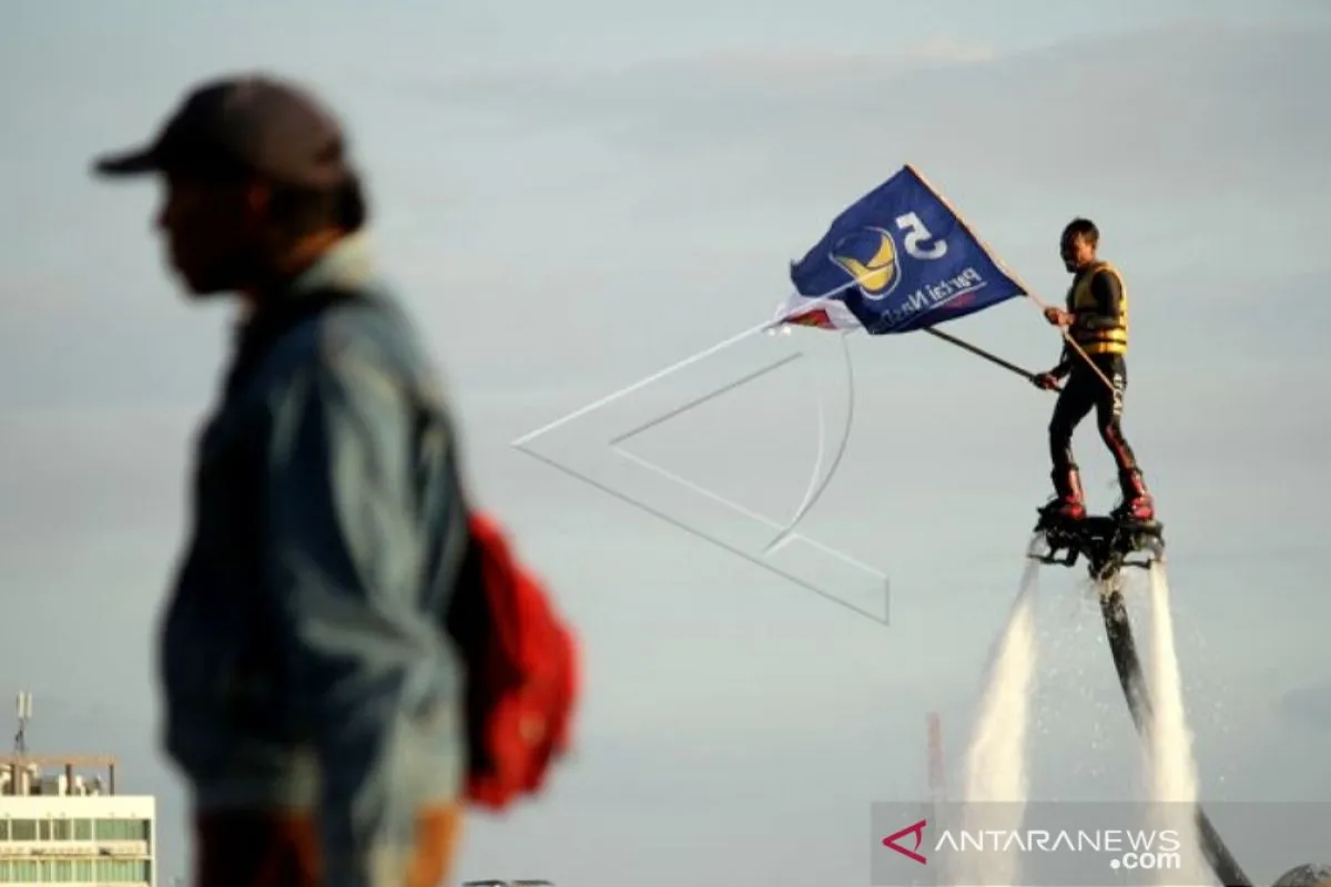 Ilustrasi - Simpatisan bermain "Flyboard" sambil membawa bendera partai pengusung pasangan bakal calon Wali Kota dan Wakil Wali Kota Makassar Mohammad Ramadhan Pomanto dan Fatmawati Rusdi saat melakukan deklarasi di Pantai Losari, Makassar, Sulawesi Selatan, Kamis (3/9/2020). ANTARA FOTO/Arnas Padda.