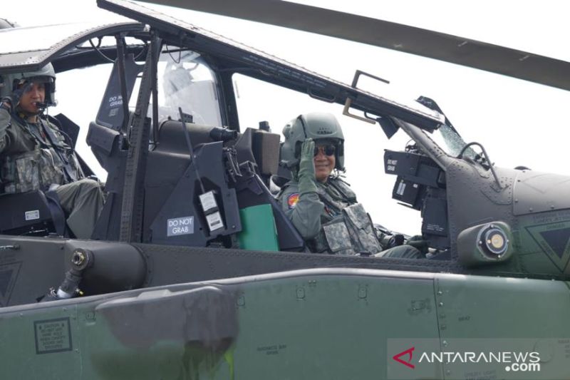 Kepala Staf Angkatan Darat (Kasad) Jenderal TNI Dudung Abdurachman menerbangkan Helikopter Serbu AH-64E Apache buatan Amerika Serikat.