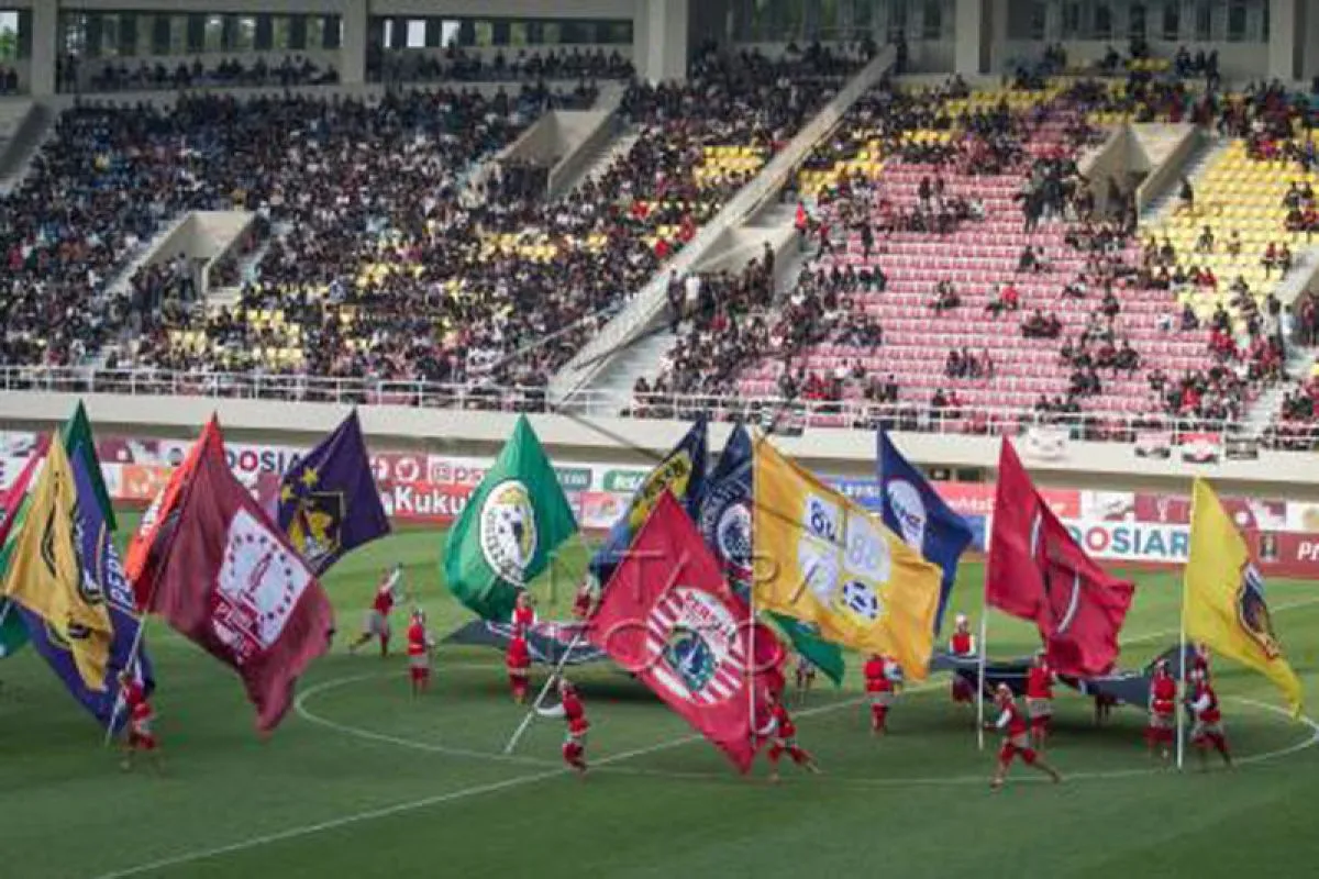 Penari membawa bendera klub sepak bola pada acara pembukaan Piala Presiden 2022 di Stadion Manahan, Solo, Jawa Tengah, Sabtu (11/6/2022). Pertandingan sepak bola Piala Presiden 2022 diikuti 18 klub dibagi menjadi empat grup dengan pertandingan pembuka mempertemukan Persis Solo melawan PSS Sleman. ANTARA FOTO/Mohammad Ayudha/nym.