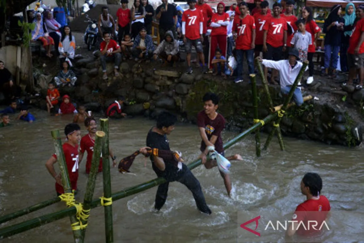 Dua orang warga saling memukul menggunakan bantal saat mengikuti lomba pukul bantal di kanal Kecamatan Manggala, Makassar, Sulawesi Selatan, Minggu (14/8/2022). Sejumlah warga kota Makassar melakukan beberapa perlombaan rakyat untuk menyambut semarak HUT ke-77 Kemerdekaan Republik Indonesa. ANTARA FOTO/Abriawan Abhe/hp.