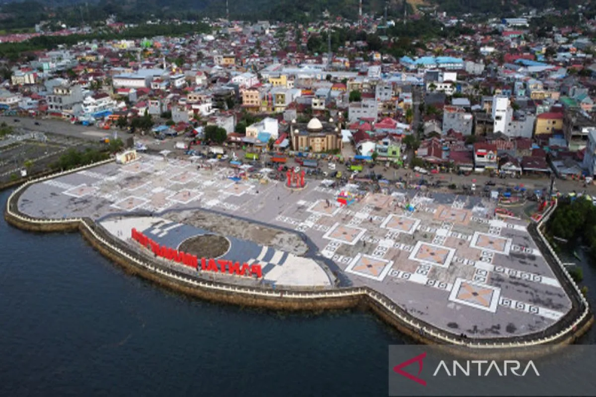 Foto udara anjungan Pantai Manakarra di Mamuju, Sulawesi Barat, Minggu (11/9/2022). Anjungan Pantai Manakarra merupakan icon kota Mamuju yang ramai dikunjungi di akhir pekan terutama pengunjung yang sudah berkeluarga. ANTARA FOTO/ Akbar Tado/foc.