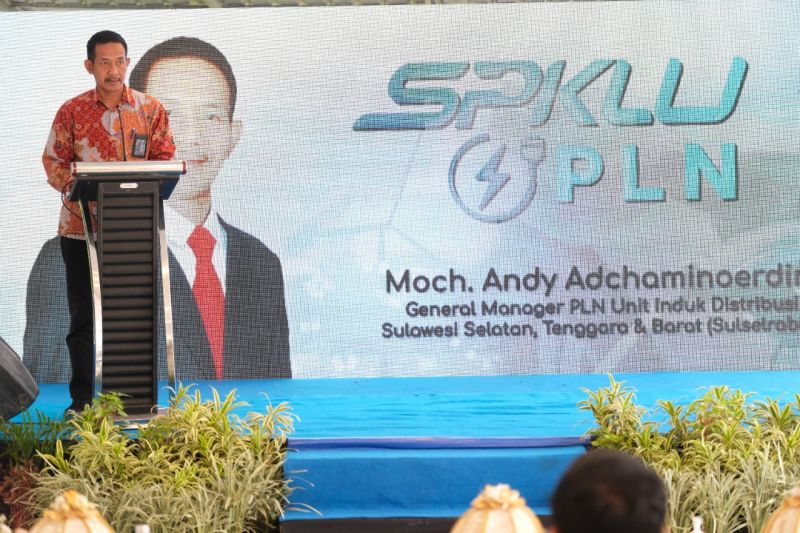 General Manager PT PLN Unit Induk Distribusi Sulawesi Selatan, Sulawesi Tenggara dan Sulawesi Barat (UID Sulselrabar) Moch Andy Adchaminoerdin pada peresmian SPKLU di Kantor Gubernur Sulsel, Makassar, Jumat (18/11/2022). ANTARA/HO-Humas PLN UID Sulselrabar