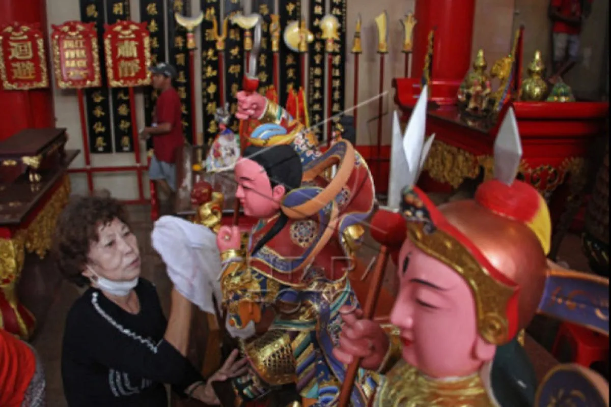 Warga keturunan Tionghoa membersihkan patung dewa di Kelenteng Xian Ma, Makassar, Sulawesi Selatan, Senin (16/1/2023). Pencucian patung dewa tersebut sebagai persiapan menyambut tahun baru Imlek 2574 Kongzili yang jatuh pada 22 Januari 2023. ANTARA FOTO/Arnas Padda/rwa.