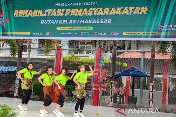 Warga Binaan Pemasyarakatan (WBP) peserta rehabilitasi narkoba menunjukkan penampilannya saat pembukaan Rehabilitasi Pemasyarakatan di halaman Rumah Tahanan (Rutan) Kelas I Makassar, Sulawesi Selatan, Senin (30/1/2023). ANTARA/Darwin Fatir.