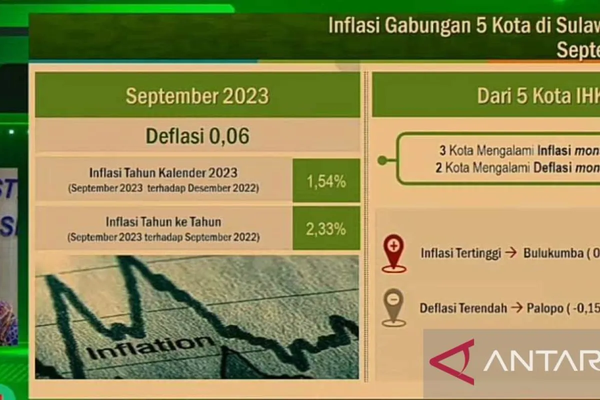 Makassar, Sulsel (ANTARA) - Badan Pusat Statistik (BPS) mencatat Provinsi Sulawesi Selatan mengalami deflasi pada September 2023 sebesar 0,06 persen secara bulanan (month-to-month/mtm).