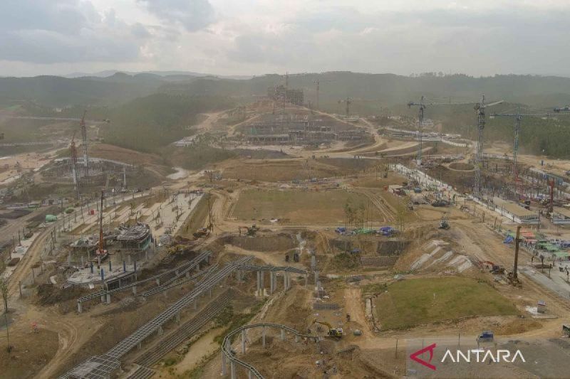 Foto udara proses pembangunan di Kawasan Inti Pusat Pemerintahan (KIPP) Ibu Kota Negara (IKN) Nusantara, Penajam Paser Utara, Kalimantan Timur. ANTARA FOTO/M Risyal Hidayat/nym.
