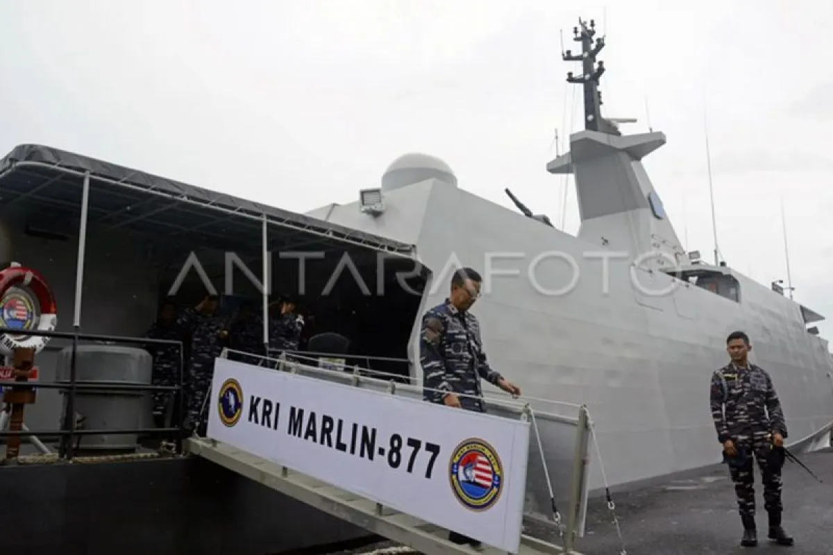 Komandan Lantamal VI (Danlantamal VI) Laksamana Pertama TNI Ivan Gatot Prijanto turun dari Kapal KRI Marlin-877 di Mako Lantamal VI Makassar, Sulawesi Selatan, Rabu (7/2/2024). Kapal patroli cepat KRI Marlin-877 yang dipersenjatai satu unit meriam kaliber 40mm dan dua unit senapan mesi berat 12,7mm tersebut merupakan produksi kapal dalam negeri yang nantinya akan memperkuat armada laut TNI AL di wilayah satuan patroli (satrol) Lantamal VI Makassar. ANTARA FOTO/Hasrul Said/YU/aww.