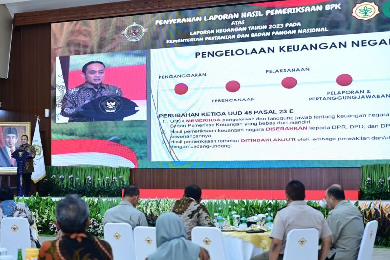 "Penurunan opini dari WTP pada tahun 2022 menjadi WDP di Kementan disebabkan oleh beberapa permasalahan material yang mempengaruhi laporan keuangan, di antaranya adalah belanja barang tidak diyakini kewajaran/keterjadiannya sebesar Rp242,65 miliar, dan pemborosan keuangan negara atas belanja barang yang tidak seharusnya dibayarkan sebesar Rp1,85 miliar," ungkap Anggota IV BPK Haerul Saleh saat menyampaikan laporan hasil pemeriksaan (LHP) atas LK Kementan dan Bapans kepada Inspektur Jenderal Kementerian Pertanian (Kementan) Setyo Budiyanto dan Kepala Badan Pangan Nasional (Bapanas) Arief Prasetyo Adi, dikutip dari keterangan resmi, Jakarta, Minggu.