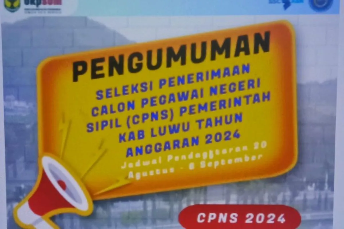 Kabupaten Luwu resmi mengumumkan pendaftaran seleksi CPNS 2024 pada Senin (19/8) melalui surat resmi Penjabat Bupati Luwu Nomor: 800/83/BKPSDM/VIII/2024 tentang Seleksi Pengadaan Pegawai Negeri Sipil (CPNS) Lingkup Pemerintah Kabupaten Luwu Tahun Anggaran 2024.