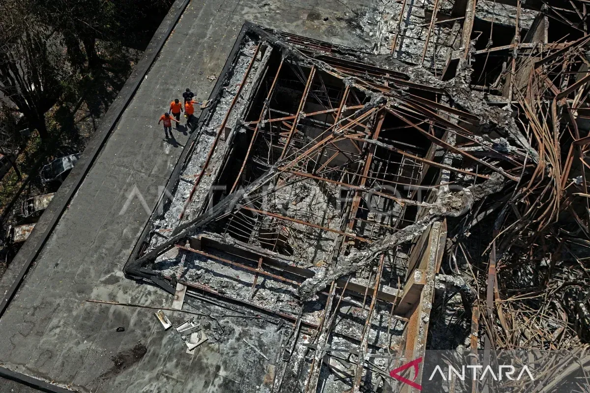 Foto udara tim Inafis melakukan olah tempat kejadian perkara (TKP) di kantor DPRD Makassar, Sulawesi Selatan, Senin (1/9/2025). ANTARA FOTO/Hasrul Said.