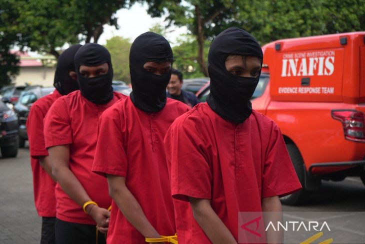Sejumlah pelaku dihadirkan saat rilis tersangka dan barang bukti kerusuhan dan pembakaran Kantor DPRD Sulsel dan DPRD Makasar di Mapolda Sulsel, Jalan Perintis Kemerdekaan, Makassar, Sulawesi Selatan, Kamis (4/9/2025). (ANTARA/Darwin Fatir)