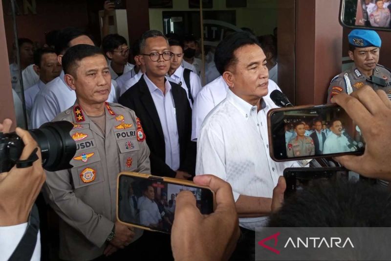 Menko Kumham Imipas Yusril Ihza Mahendra usai menemui para terduga pelaku pembakaran kantor DPRD Makassar dan Sulsel di sel tahanan Mapolda Sulsel, Rabu (10/9/2025). ANTARA/Muh Hasanuddin