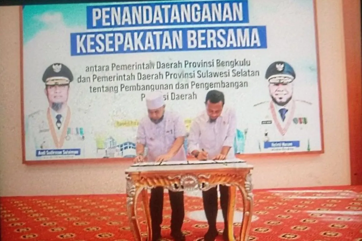Makassar (ANTARA) - Gubernur Sulawesi Selatan Andi Sudirman Sulaiman dan Gubernur Bengkulu Helmi Hasan menandatangani kesepakatan bersama antara Pemprov Sulsel dan Bengkulu dalam pembangunan dan pengembangan potensi daerah.