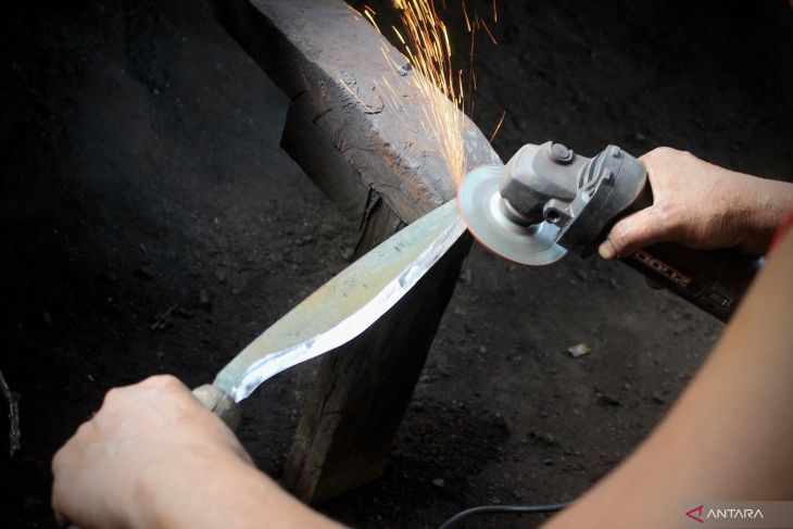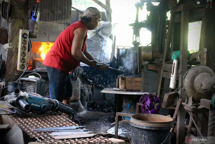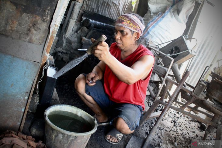 Makassar (ANTARA) - Pengrajin besi, Sudirman Larif (45) sedang menempa besi untuk memberi bentuk pada badik yang dibuat di Desa Pakkatto, Gowa, Sulawesi Selatan, Selasa (7/10/2025).