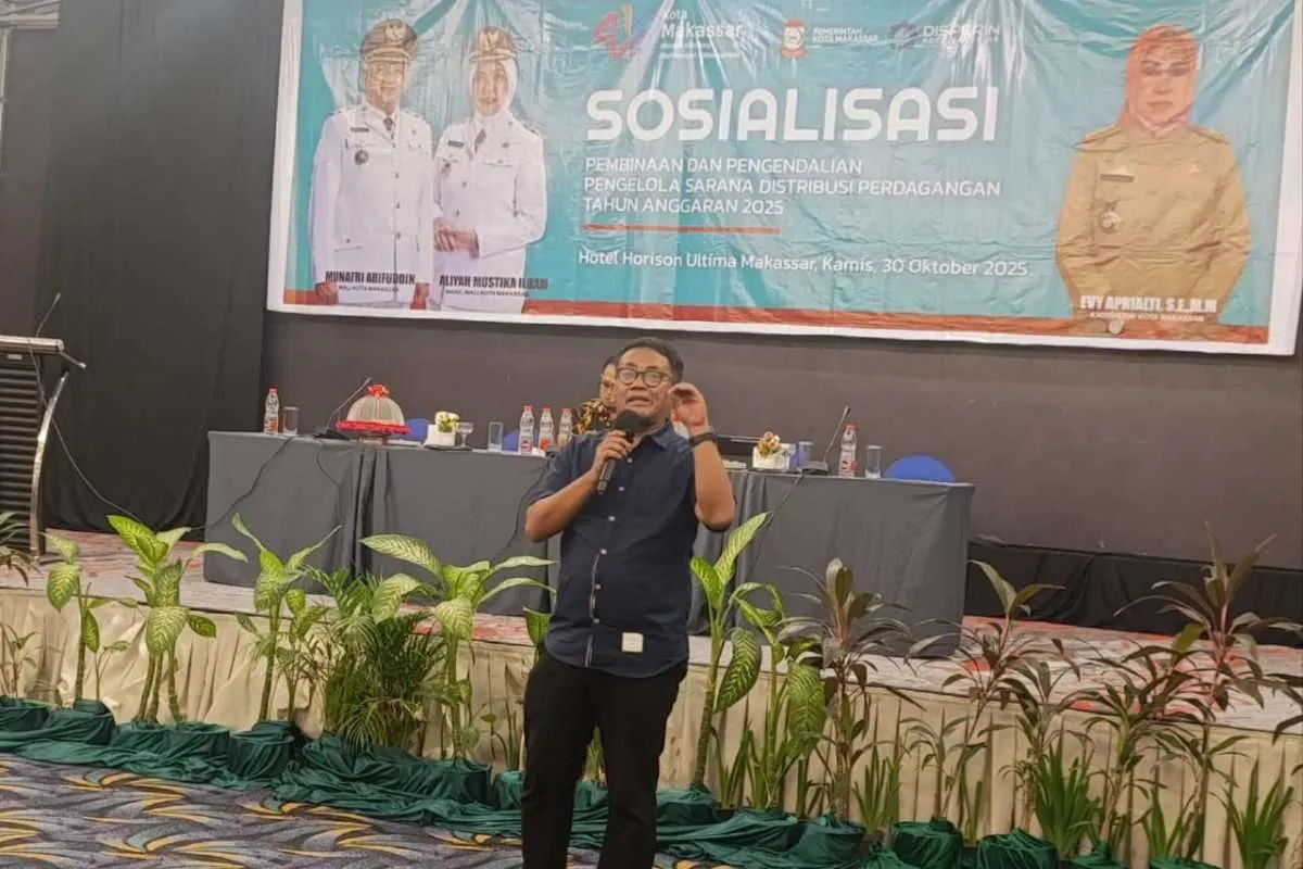 Direktur Utama Perumda Pasar Makassar Ali Gauli Arief saat sosialisasi pembinaan dan pengendalian pengelolaan sarana distribusi perdagangan di Makassar, Kamis (30/10/2025). ANTARA/HO-Muh Idris