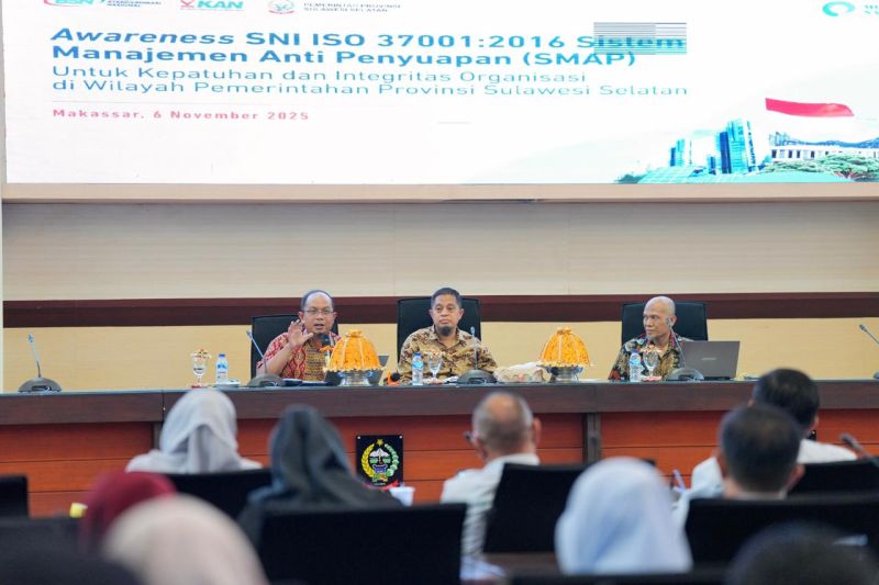 Makassar (ANTARA) - Pemerintah Provinsi Sulawesi Selatan gandeng Badan Standardisasi Nasional (BSN) terapkan SNI ISO 37001:2016 Sistem Manajemen Anti Penyuapan (SMAP) untuk kepatuhan dan integritas organisasi di lingkup Pemprov Sulsel.