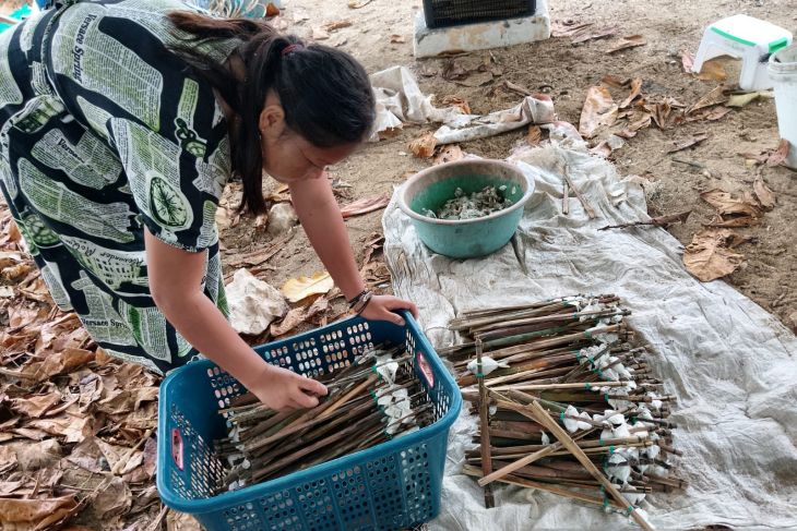 Ilustrasi perempuan di Pulau Sabutung, Desa Mattiro Kanja, Kecamatan Liukang Tupabiring Utara, Kapuaten Pangkep, Sulawesi Selatan yang membantu suaminya menyiapkan umpan untuk menangkap kepiting di laut. ANTARA/ Suriani Mappong