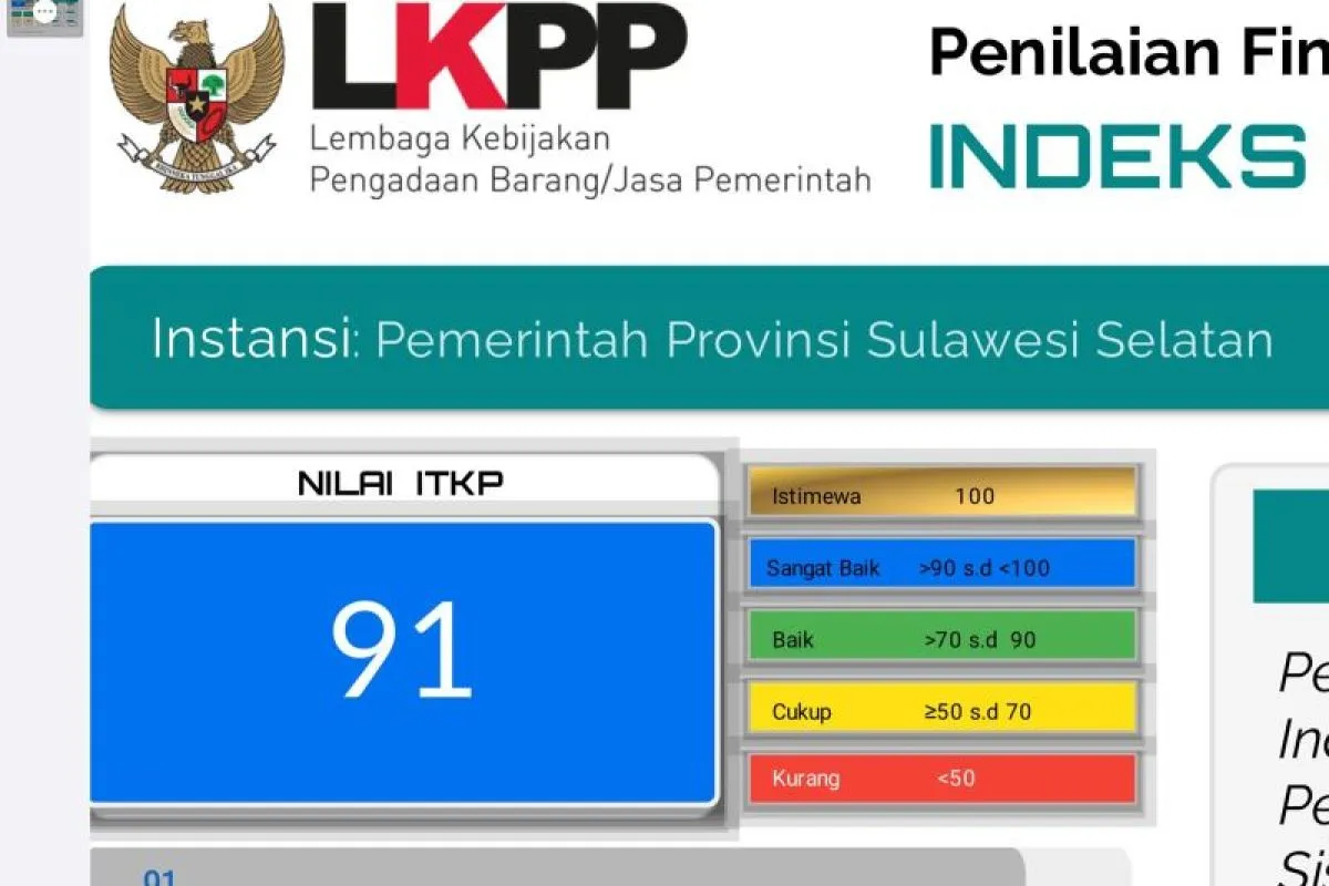 Hasil penilaian yang dirilis oleh Lembaga Kebijakan Pengadaan Barang/Jasa Pemerintah (LKPP) RI menunjukkan bahwa Pemprov Sulsel berhasil mencatatkan total nilai pembobotan sebesar 91,00.