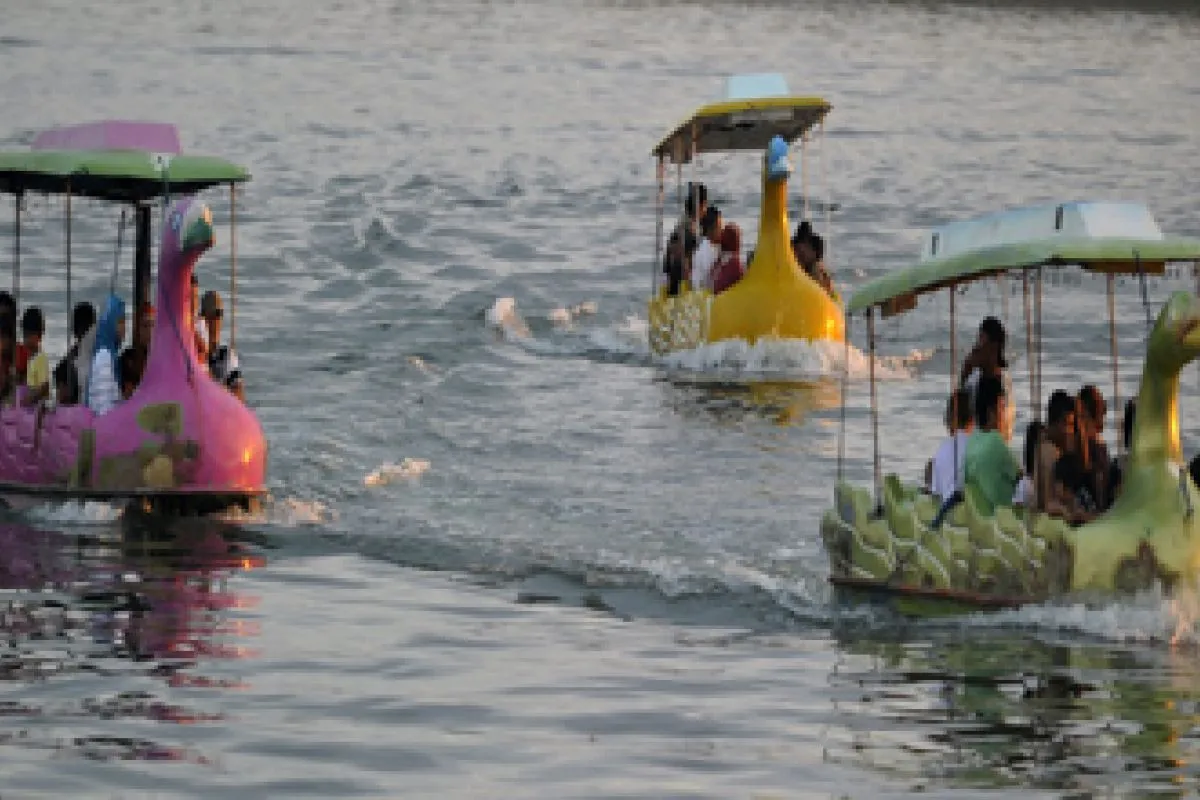 MAKASSAR - Sejumlah warga manikmati matahari tenggelam (sunset) sambil naik perahu bebek di Pantai Losari Makassar, Sulsel, Minggu (8/7). Sejumlah warga Makassar menikmati pekan terakhir masa liburan sekolah dengan berekareasi dan menunjungi daerah wisata di Makassar bersama kelurga. FOTO ANTARA/Yusran Uccang/12
