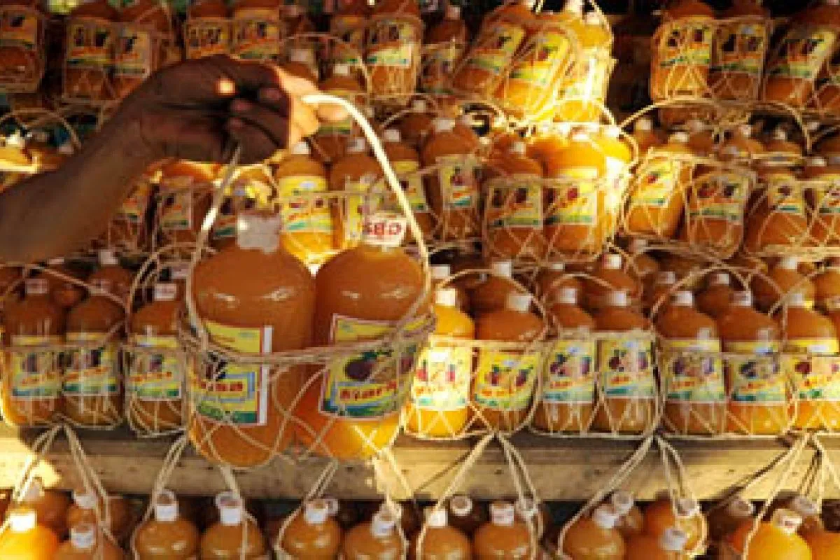 MAKASSAR - Seorang penjual memperlihatkan sirup markisa jualannya di Makassar, Sulsel, Selasa (7/8). Selama bulan Ramadhan 1433 H, permintaan sirup terus meningkat dan saat menjelang hari raya sirup khan Makassar tersebut dijadikan ole-ole saat mudik. FOTO ANTARA/Yusran Uccang/12