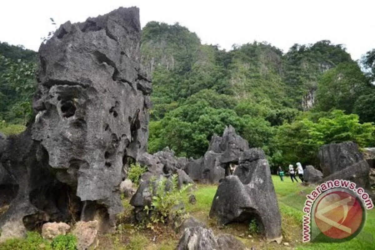 Wisatawan menyusuri taman prasejarah Leang-leang, Kel. Leang-leang, Kab. Maros, Sulsel, Rabu (5/1). Kawasan Leang-leang berada di perbukitan cadas (karst) yang memiliki ratusan Leang (gua) serta sejumlah lukisan dan peninggalan manusia prasejarah yang diperkirakan pernah dihuni pada 5000 tahun sebelum Masehi. ANTARA FOTO/Dewi Fajriani/ama/14