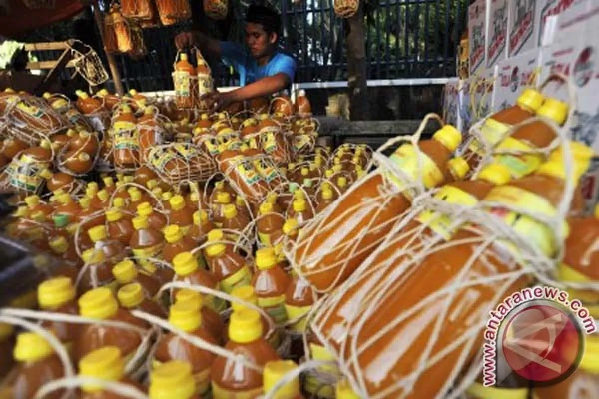 Pedagang merapikan sirup markisa jualannya di Makassar, Sulsel, Sabtu (12/7). Sirup markisa yang dijual Rp15.000 per botol dan merupakan minuman khas Makassar tersebut biasanya dijadikan ole-ole saat mudik Lebaran. ANTARA FOTO/Yusran Uccang/ed/ama/14