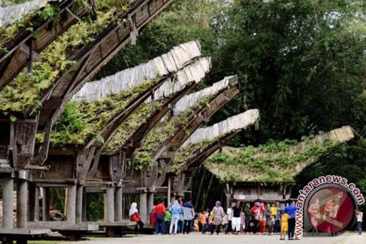 Sejumlah wisatawan mengunjungi objek wisata rumah adat Tongkonan di Kete Kesu, Toraja Utara, Sulsel, Jumat (1/8). Rumah adat Tongkonan Kete Kesu merupakan salah satu objek wisata di Toraja yang ramai dikunjungi wisatawan domestik saat liburan lebaran. ANTARA FOTO/Sahrul Manda Tikupadang/Asf/Spt/14.