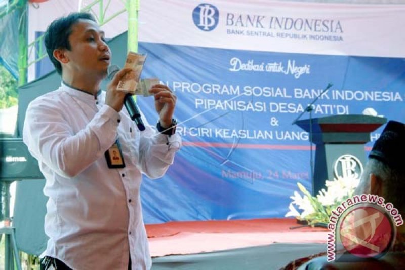 Pegawai kantor perwakilan Bank Indonesia (BI) Sulbar mensosialisasikan ciri keaslian uang rupiah kepada warga Desa Pati\'di Kabupaten Mamuju, Sulawesi Barat, Jumat (24/3). Bank Indonesia (BI) Provinsi Sulbar melaksanakan sosialisasi ciri keaslian uang dan penukaran uang rupiah Tahun emisi 2016 dan serah terima Program Sosial Bank Indonesia (PSBI) di desa tersebut.ANTARA FOTO/Akbar Tado/ama/17.