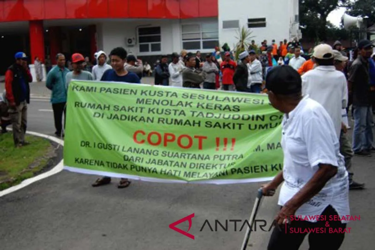 Sejumlah penderita penyakit kusta melakukan aksi unjuk rasa di Rumah Sakit Tadjuddin Chalid Makassar, Sulawesi Selatan, Selasa (20/3/18). Mereka menolak rumah sakit Tadjuddin Chalid dijadikan sebagai rumah sakit umum yang dulunya hanya diperuntukkan menangani pasien penderita penyakit kusta. ANTARA FOTO/Abriawan Abhe