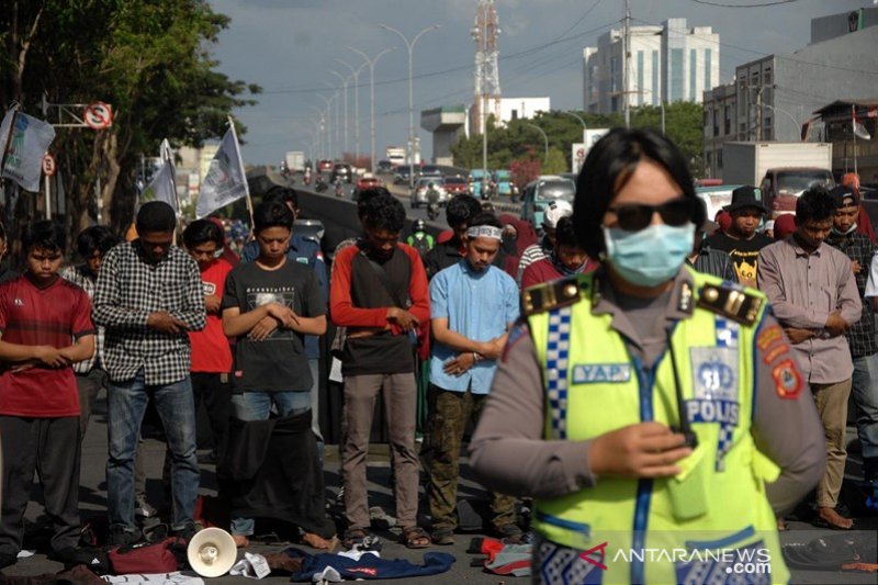 Mahasiswa yang tergabung dalam Kesatuan Aksi Mahasiswa Muslim Indonesia (KAMMI) menggelar shalat berjamaah saat berunjuk rasa di depan kantor DPRD Sulsel, Makassar, Sulawesi Selatan, Rabu (25/9/2019). Aksi unjuk rasa menolak Undang-undang yang diusulkan oleh DPR tersebut masih terus dilakukan mahasiswa di sejumlah tempat di Makassar. ANTARA FOTO/Abriawan Abhe/YU