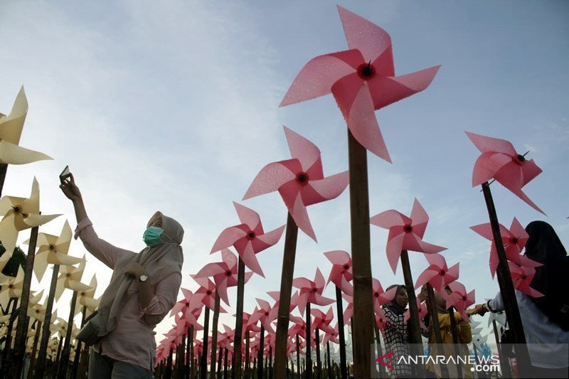 Wisatawan berswafoto di kebun kincir angin "Rainbow Garden" di Kelurahan Tamarunang, Gowa, Sulawesi Selatan, Minggu (14/6/2020). Wisata kebun kincir angin tersebut ramai dikunjungi wisatawan untuk berswafoto saat libur akhir pekan dengan tarif masuk Rp10 ribu per orang. ANTARA FOTO/Arnas Padda/yu