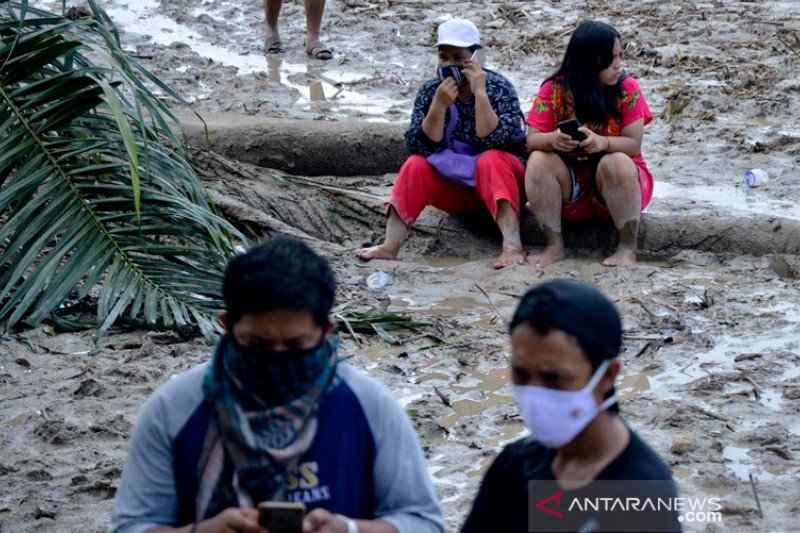 Warga korban banjir bandang menelpon kerabatnya di sekitar material lumpur pasca banjir bandang di Desa Radda, Kabupaten Luwu Utara, Sulawesi Selatan, Sabtu (18/7/2020). Telkomsel memberikan Layanan Telpon 50 Menit dan 250 SMS Gratis ke Semua Operator untuk memperlancar kebutuhan komunikasi terhadap warga terdampak bencana banjir bandang di Luwu Utara. ANTARA FOTO/Abriawan Abhe/yu