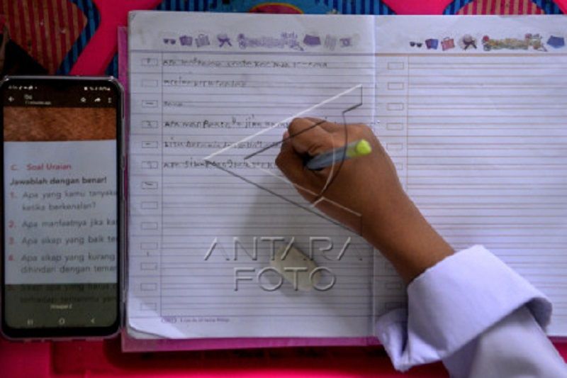 Siswa SD Inpres Hartaco Indah mengikuti pembelajaran jarak jauh dari rumahnya di Kabupaten Gowa, Sulawesi Selatan, Selasa (21/2/2023). Pemerintah Kota Makassar memberlakukan pembelajaran jarak jauh kepada pelajar tingkat SD dan SMP untuk mengantisipasi peringatan BMKG terhadap potensi cuaca ekstrem yang terjadi di Makassar hingga Kamis (23/2). ANTARA FOTO/Abriawan Abhe/foc.