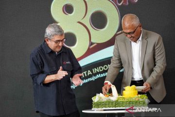 Direktur Utama Perum LKBN ANTARA, Akhmad Munir (kanan) memotong tumpeng disaksikan Ketua Dewan Pengawas Perum LKBN ANTARA Kemal Gani (kiri) saat perayaan HUT ke-86 Perum LKBN ANTARA di Wisma ANTARA B, Cikini, Jakarta, Rabu (13/12/2023). ANTARA/Khafie/YU
