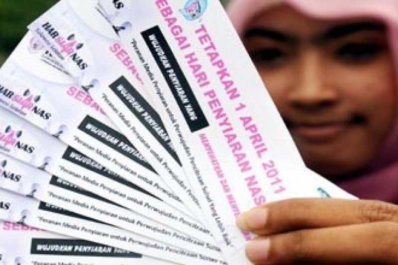 MAKASSAR - Sejumlah pengunjukrasa yang tergabung dalam Masyarakat Penyiar Sulsel melakukan aksi seruan Hari Penyiaran Nasional (Harsiarnas) di Monumen Mandala Makassar, Jumat (1/4). Mereka meminta agar pemerintah segera menetapkan tanggal 1 April sebagai Hari Penyisran Nasional dan meminta agar media penyiaran menyajikan tayangan yang lebih mendidik masyarakat. FOTO ANTARA/Yusran Uccang/11