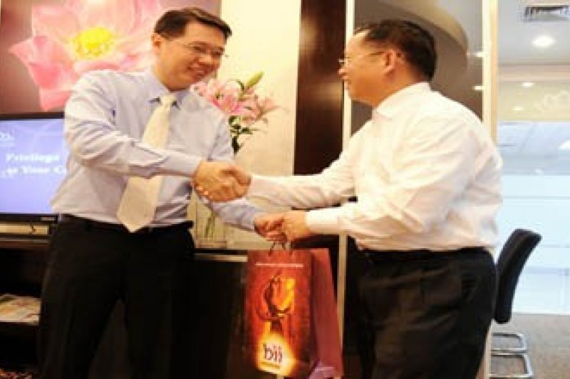 MAKASSAR, SULSEL - Senior Vice President Funding Business Bank Internasional Indonesia (BII), Stefabus Willy Sukianto (kiri) memberikan paket kepada salah seorang nasabah saat peresmian layanan wealth management Platinum Access di Kantor BBI Cabang Makassar, Sulsel, Rabu (27/11). Platinum access tersebut diluncurkan guna meningkatkan pelayanan terhadap nasabah. FOTO ANTARA/Yusran Uccang/11