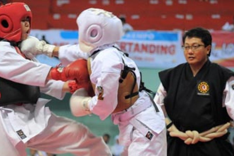 MAKASSAR - Kenshi Jawa Barat, Nutya Uchriaty Sudrajat (kanan) dan kenshi Brunai Darussalam, Rafidah Rusli (kiri), saling melepas pukulan kelas randori putri 42 kilogram, kejuaraan Nasional Shorinji Kempo Indonesia Open dan Kualifikasi PON XVIII di Gor Sudiang, Makassar, Sulsel, Minggu (24/7). Nutya Uchriaty Sudrajat berhasil mengalahkan lawannya dari Brunai Darussalam dan memperoleh emas di kelas randori putri 42 kilogram. FOTO ANTARA/Sahrul Manda Taiakupadang/11