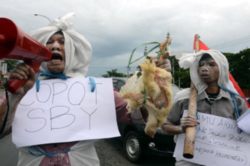 MAKASSAR, SULSEL - Dua pengunjukrasa melakukan teatrikal dengan memakai pocong dan membawa ayam saat melakukan aksi solidaritas untuk Sondang Hutagalung di gedung DPRD Sulsel, Makassar, Kamis (15/12). Dalam aksinya, mereka meminta agar pemerintah lebih memperhatikan masalah-masalah rakyat yang dinilai frustasi dengan persoalan negara, dan meminta agar pemerintah segera menyelesaikan kasus-kasus negara yang merugikan rakyat. FOTO ANTARA/Yusran Uccang/11