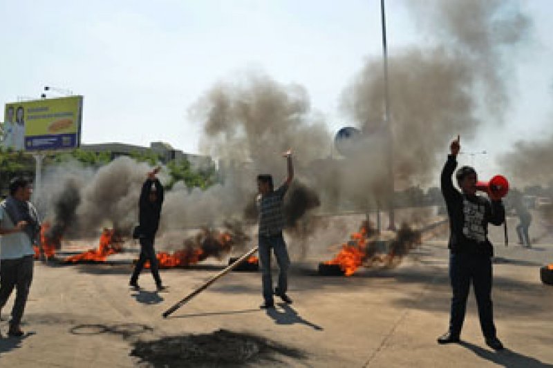 MAKASSAR - Sejumlah mahasiswa yang tergabung dalam beberapa aliansi mahasiswa Makassar menutup akses jalan Tol Reformasi saat berunjuk rasa di Makassar, Sulsel, Selasa (26/6). Mereka menutup akses jalan tol sebagai protes dan penolakan terhadap kedatangan Wakil Presiden Boediono, dalam kunjungan kerja di Makassar. FOTO ANTARA/Sahrul Manda Tikupadang/12