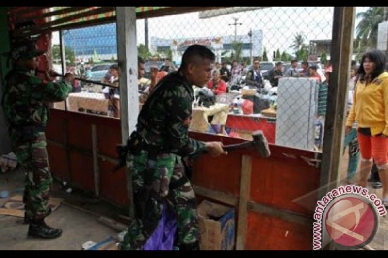 Sejumlah anggota TNI AD membongkar lapak dan rumah semi permanen di atas lahan milik TNI AD, Makassar, Sulsel, Jumat (10/1). Pesatnya pertumbuhan ekonomi perkotaan yang tidak sebanding dengan upaya menekan urbanisasi hampir selalu menjadi tren negatif dimana minimnya lahan untuk permukiman membuka jalan bagi terciptanya lingkungan kumuh. ANTARA FOTO/Ekho Ardiyanto/ss/nz/14