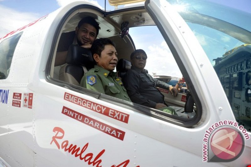 Kepala Dinas Perhubungan Sulsel Masykur Sultan (kiri) bersama bersama Bupati Tanatoraja Theo Allorerung (kanan) disaksikan Direksi Bosowa Group Munafri Arifuddin saat mencoba navigasi pada peluncuran perdana pesawat Celebes Air Bandara Sultan Hasanuddin Makassar, Sulsel, Senin (10/3). Pesawat perintis Celebes Air milik PT. Ersa Eastern Aviation yang merupakan anak perusahaan Bosowa Group tersebut akan membuka rute Makassar-Mamuju-Toraja, Luwu dan Bone. ANTARA FOTO/Yusran Uccang/14