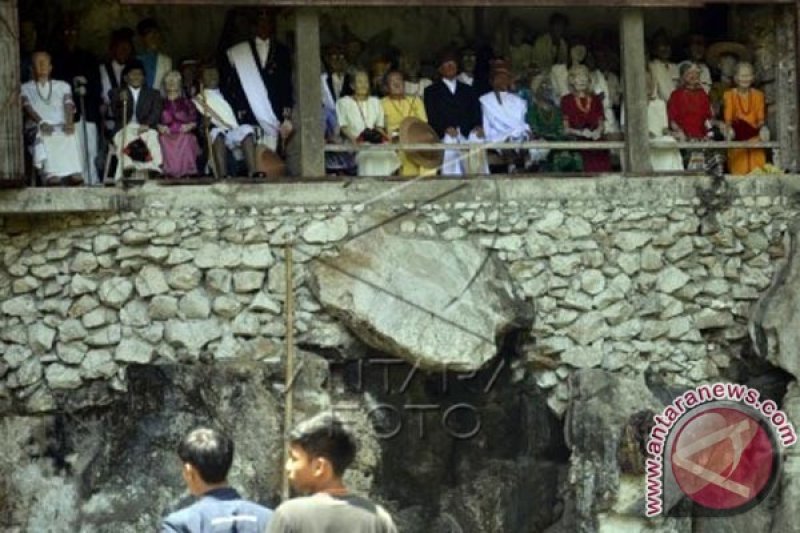 Sejumlah wisatawan mengunjungi Pekuburan Batu Londa di Toraja Utara, Sulawesi Selatan, Jumat, (14/8). Setelah kawasan tersebut ditetapkan Kementerian Kebudayaan dan Pariwisata sebagai situs cagar budaya jumlah kunjungan wisatawan domestik maupun manca negara mengalami peningkatan 20-30 persen setiap akhir pekan. ANTARA FOTO/Darwin Fatir/kye/15.