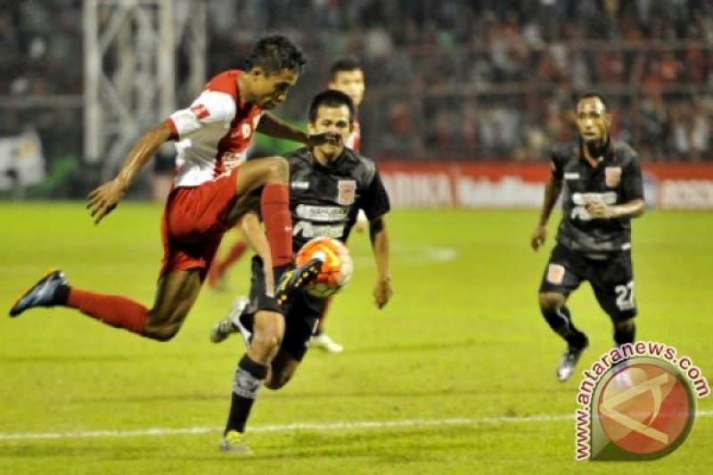 Pesepakbola PSM Makassar Ridwan Tawainela (kiri) berebut bola dengan pesepakbola Pusamania Borneo FC Hendra Ridwan (kedua kiri) saat bertanding dalam lanjutan Torabika Soccer Championship (TSC) 2016 di Stadion Mattoanging Gelora Andi Mattalatta Makassar, Sulawesi Selatan, Kamis (23/6). Tuan rumah PSM Makassar kalah atas tamunya Pusamania Borneo FC dengan skor 0-2 (0-2). ANTARA FOTO/Yusran Uccang/pd/16