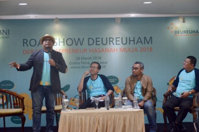 Pemilik Ayam Bakar Mas Mono, Agus Pramono (kiri) bersama CEO Financial Wisdom (kedua kiri), Pemimpin Divisi Mikro BNl Syariah Budi Aristianto (kedua kanan) dan Direktur Akses Perbankan Bekraf Restog K Kusuma (kanan) menghadiri roadshow Derap Ekrafpreneur Hasanah Mulia (Deureuham) di Graha Pena Makassar, Sulawesi Selatan, Rabu (28/3). Kegiatan itu bertujuan membantu pelaku usaha untuk mengembangkan bisnisnya. ANTARA FOTO/Darwin Fatir/YU/18.